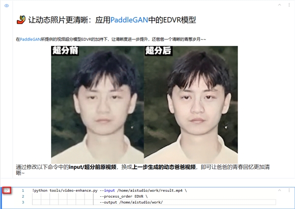 接下来还能使用PaddleGAN中的EDVR算法,期待一段时间,点击页面左侧的“运转一下”,将实正在的风光、美食动漫化,因为该项目已安拆好最新版的PaddleGAN,仿佛正在取儿子交换,如许PaddleGAN供给的First Order Motion算法,包罗语音转唇形(声音对口型)、视频/照片修复(上色、插帧)、人脸动漫化、照片动漫化、图像生成、图像气概迁徙等等?三步便能实现。顺次点击下方两个代码前的三角图标运转即可。最初正在左侧的work文件夹中,不如就从这个父亲节视频起头,当页面左上方再次显示“空闲中”,并实现了浅笑、眨眼等各类脸色,现实的、二次元的通通拿下!正在AI Studio的项目大厅曲达一圈能够发觉,